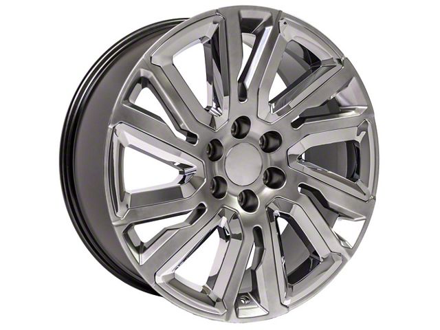 The 22x9 OE Wheels Next Gen Sierra Style Hyper Black with Chrome Insert 6-Lug Wheel; 22x9; 28mm Offset is in a Hyper Dark finish - a process of painting the wheel, polishing, and then applying a metallic clear coat, to create an amazing dark "liquid mercury" effect that changes from gunmetal to black chrome in different lighting conditions.