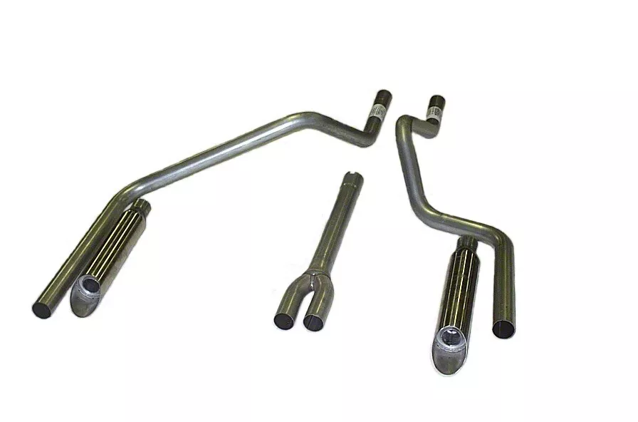 Construction and Appearance. Constructed from durable aluminized steel, this exhaust system offers excellent resistance to corrosion and wear, ensuring long-lasting performance. What's more? The system is finished with polished stainless steel angle-cut tips, providing a sleek and stylish appearance that complements the truck's rear end.