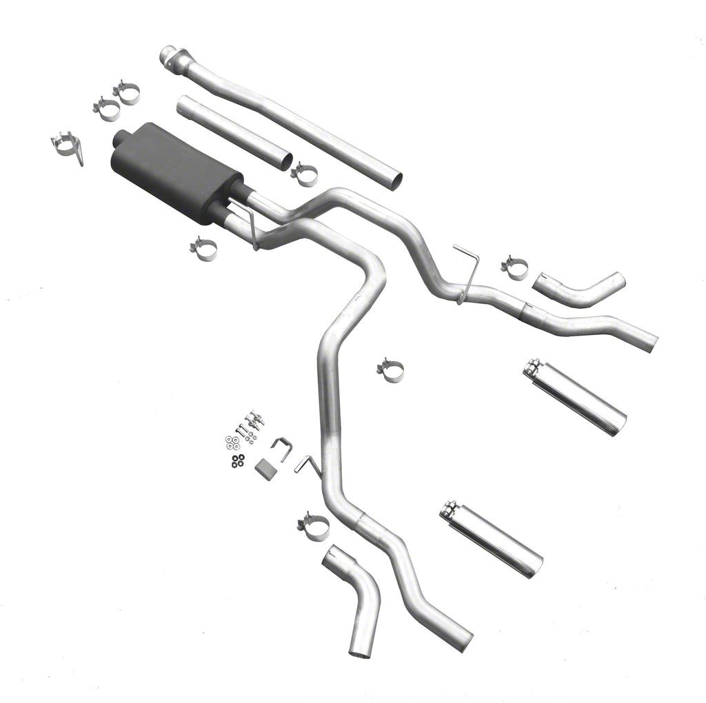 Quad Tips. Made for the 5.4L Ford F-150, this Dual Exhaust System comes in a polished chrome finish with 4 polished chrome 304 stainless steel tips. Crafted from 2.5 inch 409 stainless steel tubing, this exhaust system is a dual side and rear exit model that uses the stock hanger mounts and provides an aggressive and drone-free tone.
