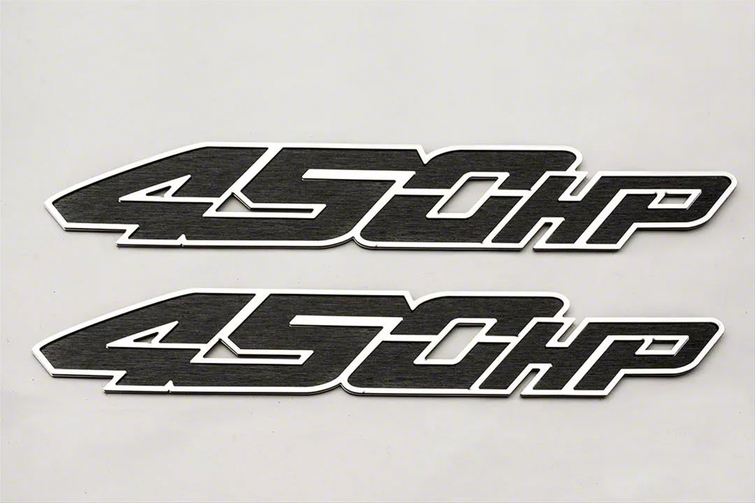 Construction and Appearance. These 450 HP Badges are made from 100% stainless steel with a black brushed vinyl finish. "450HP" flows together in these badges, adding style dimensions in subtle places. Made in the USA, these badges won't tarnish, fade, or rust.