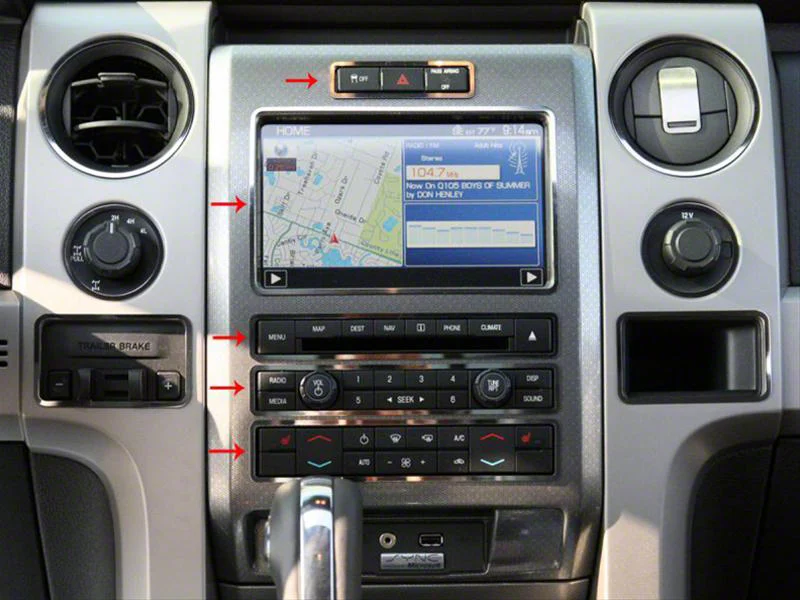 Center Dash Makeover. These Brushed Center Dash Trim Rings bring new style dimensions to the interior of your Raptor. This 5-piece set will bring out the beauty of your F-150, adding a unique appearance to your truck.