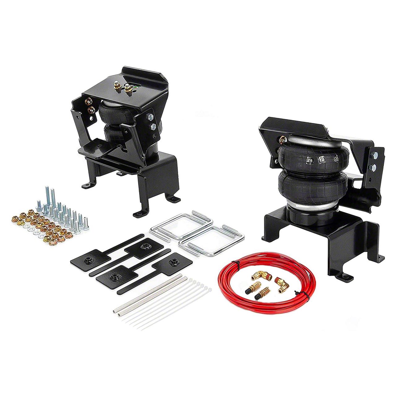 Construction and Appearance. These air helper springs are crafted from robust reinforced rubber, using OEM-style mounting plates and bushings to ensure compatibility and durability. Finished in black with corrosion-resistant mounting hardware, the kit integrates seamlessly with the existing chassis and leaf pack components, preserving factory ride aesthetics.