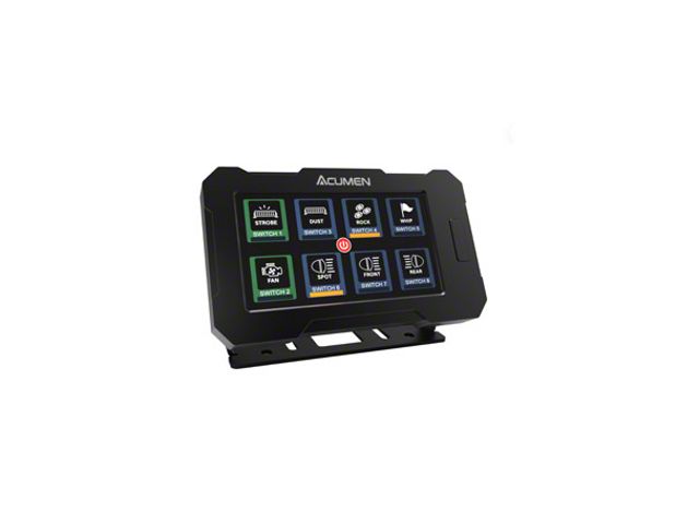 Control at Your Fingertips. Acumen The Legend Switch Panel redefines vehicle customization with its advanced features and sleek design. Sporting a matte black finish, this switch panel integrates a compact digital display, allowing for easy monitoring and control. It's not just about looks; this panel is waterproof and robust, offering up to 125 amps of power across 8 circuits, catering to all your power needs with reliability and efficiency.