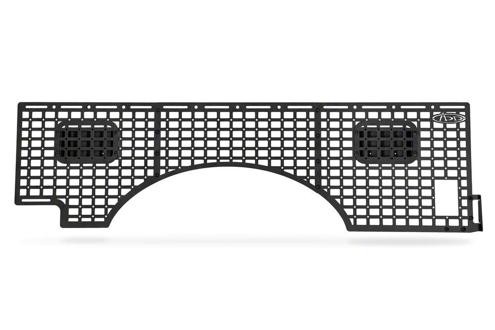 Efficient Cargo Organization. The Addictive Desert Designs Bed Side MOLLE Panels provide a durable and practical solution for organizing your truck bed. Designed specifically for the passenger side, these MOLLE panels offer a full kit to maximize usable space, allowing you to securely mount and store a variety of accessories and tools with ease.