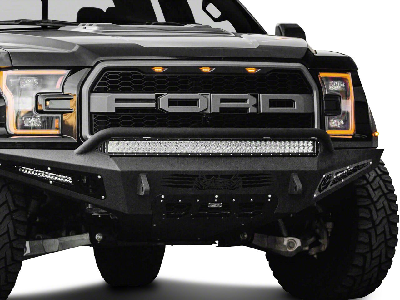 Application. Addictive Desert Designs' HoneyBadger Front Bumper fits all 2017-2020 Ford F-150 Raptors.