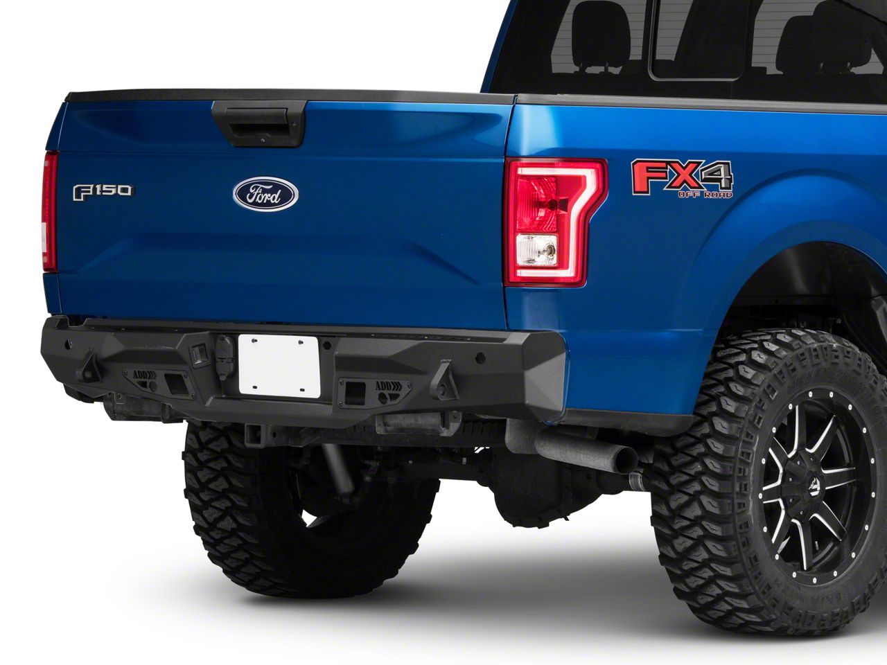 Application. The Addictive Desert Designs Stealth Fighter Rear Bumper fits all 2015–2020 Ford F-150 models, excluding the Raptor. Shipped with a black powdercoat finish, it is sold as a kit.