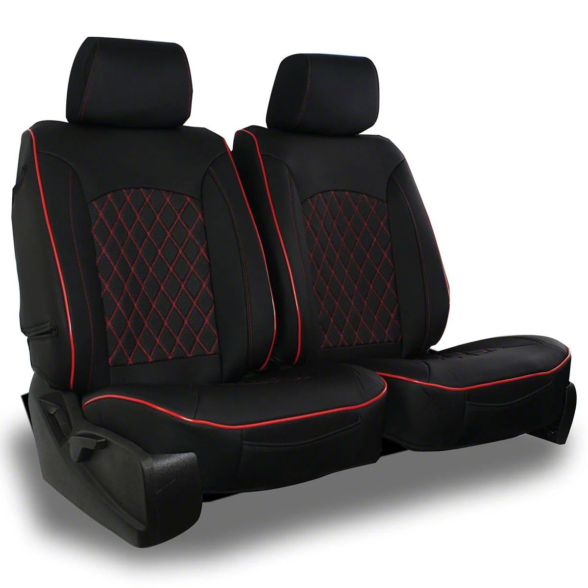 Premium Seat Cover. The Aegis Cover Leatherette Low Back Bucket Seat Covers with Diamond Insert; Black/Red Piping provides a stylish and protective upgrade for your vehicle's seats. It is designed to enhance interior aesthetics while safeguarding seats from wear, stains, and damage. This semi-custom cover is ideal for maintaining the original look and feel of your vehicle’s seating.