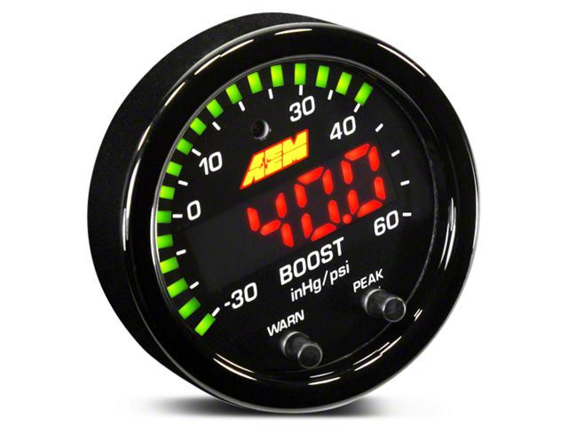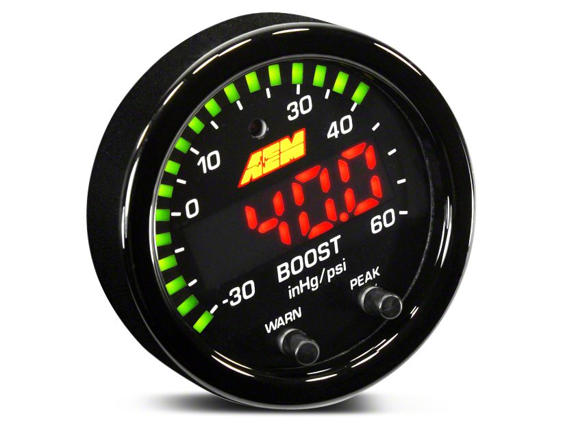 X-Series. Monitor the critical boost pressure in real time by installing AEM Electronics X-Series Boost Pressure Gauge. It features a fully digital screen with adjustable brightness and crisp display for accurate monitoring. The 24 green outer led needles stand out with the 87% larger display and provides distraction-free, at-a-glance readings. With combined great looks, reliability and over-the-top technology, the X-series lets you take full authority of your F-150 during performance and track driving.