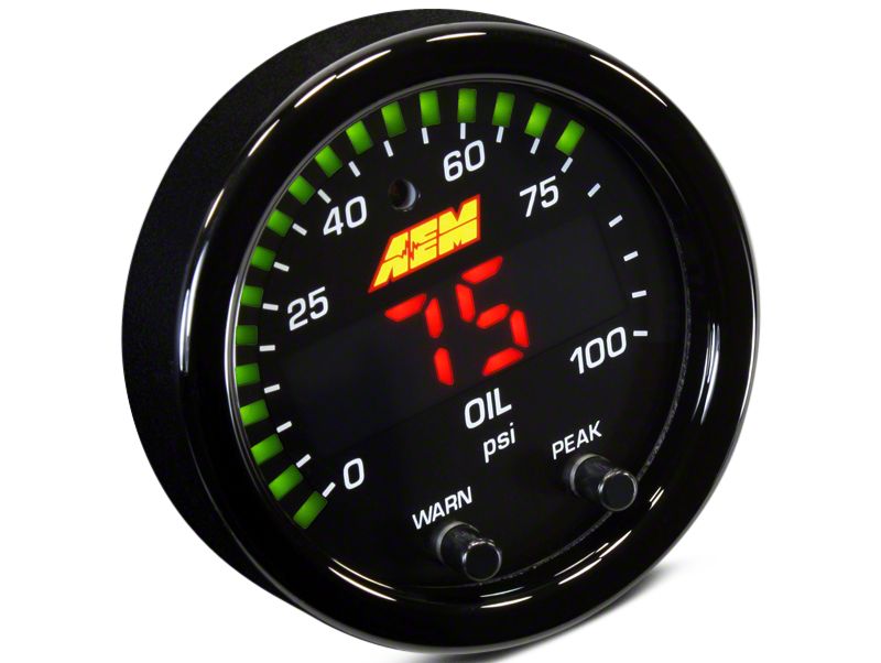 Easy to Use. It’s easy to customize the display of this oil pressure gauge. You can choose to see the pressure readout measured in standard PSI or metric BARs. The gauge features peak/recall buttons and allows the user the ability to program threshold warnings.