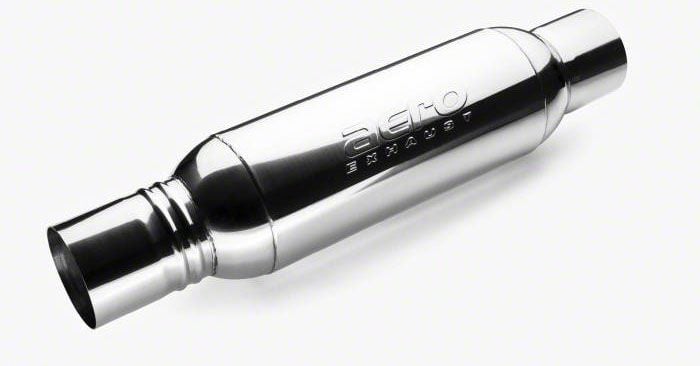 Construction and Appearance. This Aero Exhaust Turbine XL Resonated Muffler is fully welded from 304 stainless steel. The temperature-rated, ceramic, sound-dampening material cancels exhaust drone. Stamped with the Aero logo, the mirror polished finish looks sensational.