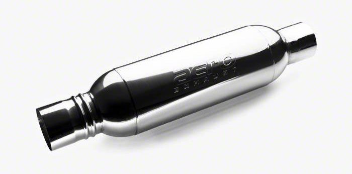 Construction and Appearance. This Aero Exhaust Turbine XL Resonated Muffler is fully welded from 304 stainless steel. The temperature-rated, ceramic, sound-dampening material cancels exhaust drone. Stamped with the Aero logo, the mirror polished finish looks sensational.