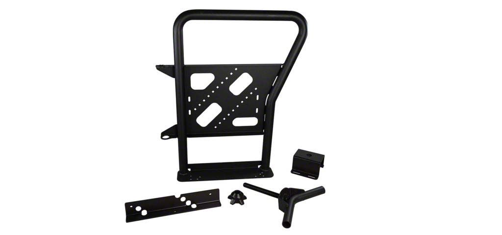 Construction and Appearance. Made from durable steel with a corrosion-resistant finish, this tire mount is built to endure tough conditions and deliver long-lasting performance. Its adjustable design accommodates various tire sizes, making it versatile for different off-road setups.