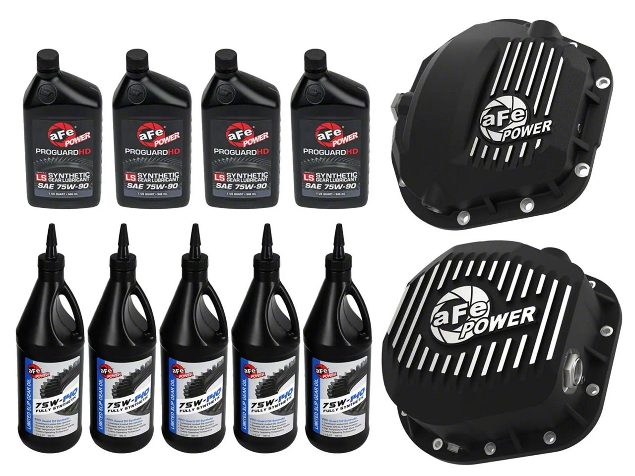 aFe Power’s Pro Series front and rear differential covers bring performance-driven protection to your drivetrain. Constructed from durable cast aluminum and designed with reinforced ribs, these covers offer enhanced strength and improved heat dissipation for demanding driving conditions.This is a complete, ready-to-install kit that includes front and rear differential covers, all necessary hardware, 4 quarts of 75W-90 and 5 quarts of 75W-140 premium PROGUARD Synthetic gear oil —everything you need for a full service in one convenient package.PROGUARD Synthetic 75W-90 & 75W-140 Gear Oil:The supplied gear oil exceeds the performance requirements of API GL-5 recommended for both open and limited slip applications.Increased Oil Capacity:These covers have an increased oil capacity over stock for better performance over a longer duration.Built-in Internal/External Fins:Built-in internal and external fins transfer heat from the oil to the outside air for maximum cooling.Magnetic Plugs:This system incorporates magnetic drain and deep reach fill plugs to capture loose particles for maximum protection.Calibration Plug:Each cover uses a calibration plug set to the factory oil level to eliminate overfilling.Oil Level Sight Glass:Each cover includes an oil level sight glass that allows for quick and easy oil inspection.When it comes to engineering for power, performance, protection and value, aFe POWER is the only choice.Emissions DisclaimerThis product does not require a CARB EO#.Fitment NoteThis kit is designed specifically for 4x4 trucks equipped with a front Dana 60/Super 60 axle and a rear Sterling 10.5"-12-bolt axle combination. Please verify your axle configuration.