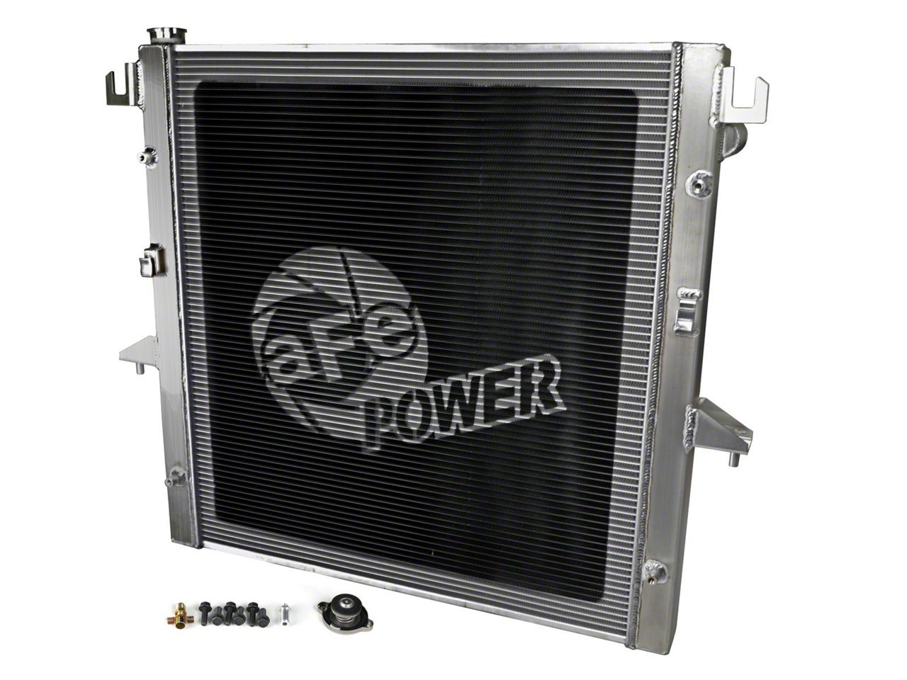 Advanced Construction and Materials. This radiator is constructed from 1/8-inch aluminum plates for efficient heat loss and billet aluminum inlets and outlets for durability. An oversized 2-inch tube and fin core adds to its cooling capability, while a brass drain valve makes fitting a hose for draining coolant easy. In addition, this radiator comes with a brushed aluminum finish for a sleek look and an AFE POWER logo painted in front.
