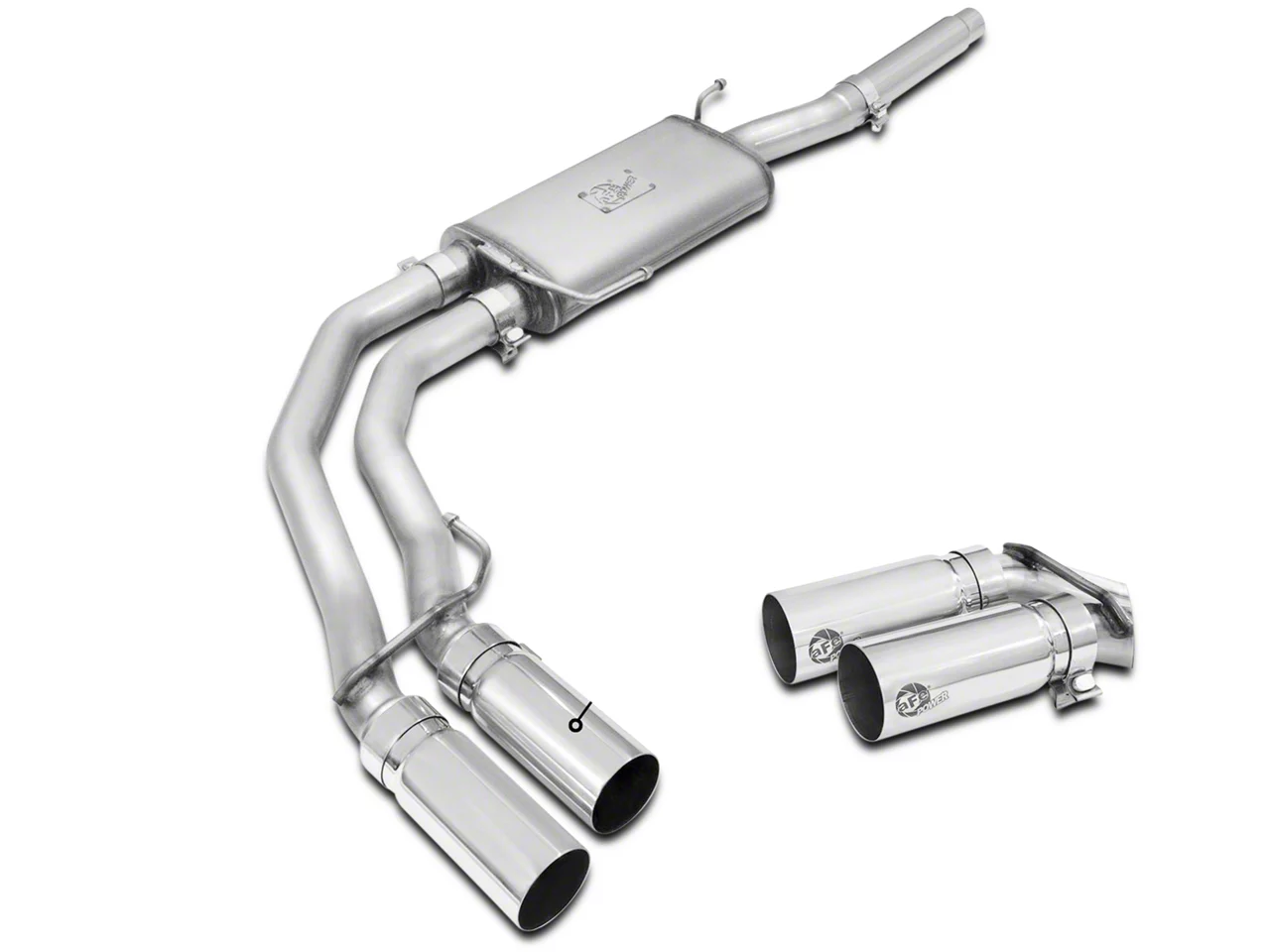 Vivid Tones. If you are looking for a more intimidating tone from your Ford F-150, the AFE Rebel Series 3 in. to 2.5 in. Cat-Back Exhaust with Polished Tips and Middle Side Exit might be what you’re looking for. Thanks to the use of a high-flow muffler, the sound of your truck won’t be nearly as restricted as with a factory muffler.