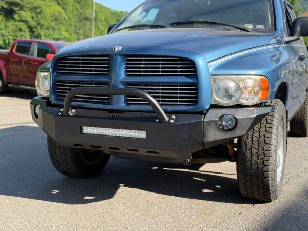 Modular Strength and Utility. The Affordable Offroad Modular Non-Winch Front Bumper with Bull Bar offers rugged functionality and aggressive styling for your 2002 to 2005 RAM 1500. Designed as a versatile, bolt-on upgrade, this modular bumper features a bold bull bar, light bar cutout, and optional fog light integration—making it ideal for off-road adventures, overland builds, and tough work trucks.