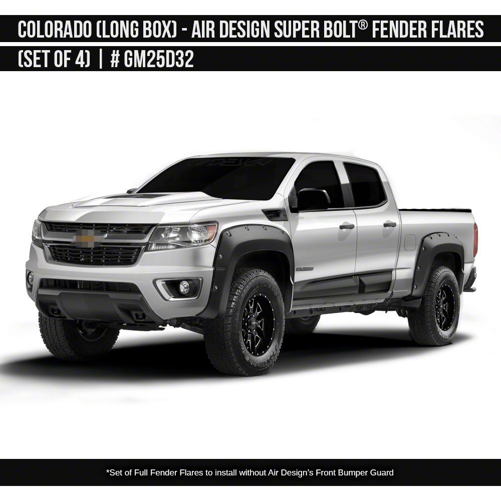 Robust Fender Flares. The Air Design Super Bolt Fender Flares provide additional tire coverage and protection from road debris for your Colorado with a 6-foot long box. These unpainted fender flares offer the flexibility to match your vehicle's exterior color, enhancing its overall appearance.