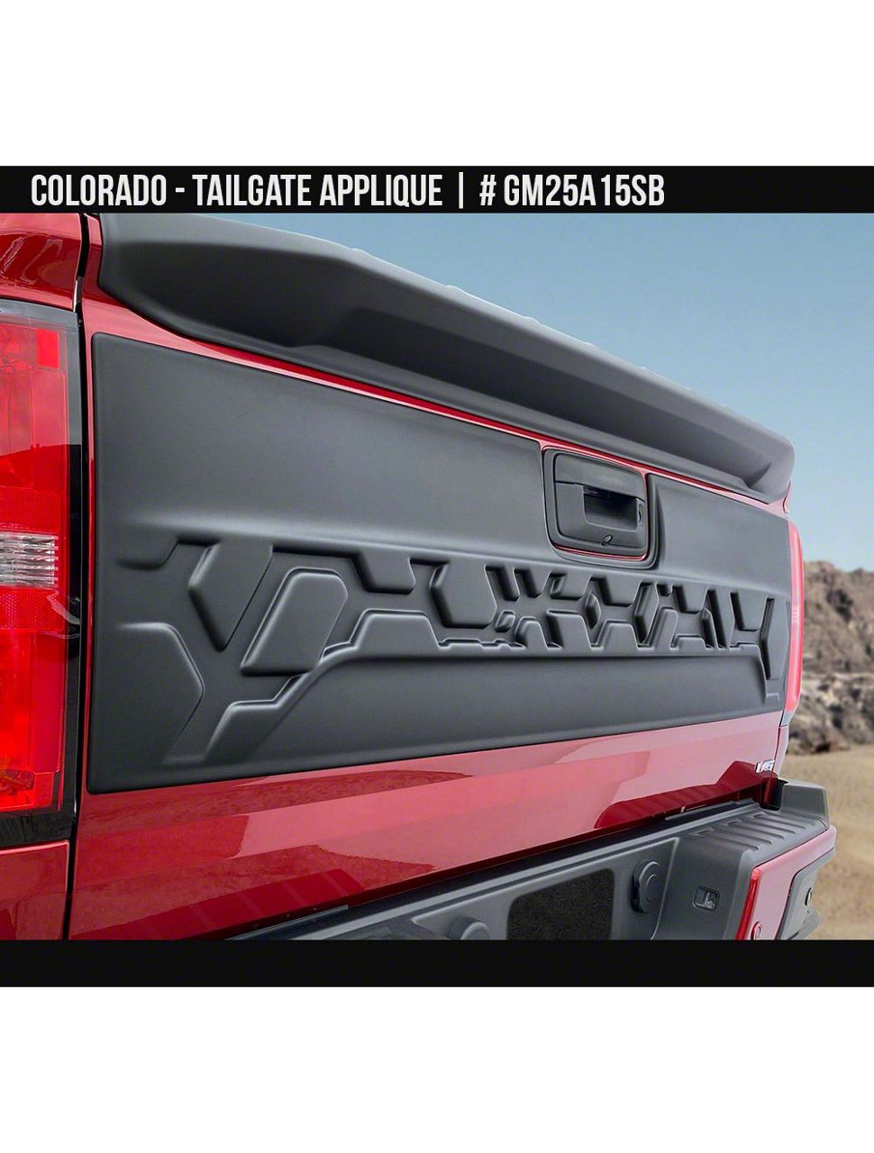Stylish Tailgate Upgrade. The Air Design Tailgate Applique provides a stylish and functional enhancement for your 2015-2022 Colorado models. This unpainted applique offers a sleek and modern look, allowing you to customize it to match your vehicle's appearance perfectly. Its design ensures a perfect fit, seamlessly integrating with your tailgate.