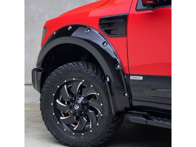 Rugged Look with Extra Protection. Equip your Ford F-150 with reliable protection from mud, sand, garbage, rocks, and dirt by installing these Air Design Super Bolt Satin Black Fender Flares. This set of fender flares stylishly transforms your vehicle and accommodates larger aftermarket tires. Furthermore, it features an integrated mud flap contour that widens the bottom of the flare, adding extra protection from road debris. Additionally, the bold contrast between the black fender flares and the bright accent studs adds an appealing ruggedness to the tough off-road stance of your truck.
