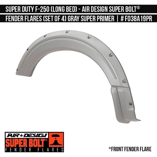 Application. The Air Design Super Bolt Fender Flares; Unpainted fit 2023-2026 F-250 Super Duty SuperCab models with 8-Foot Bed.