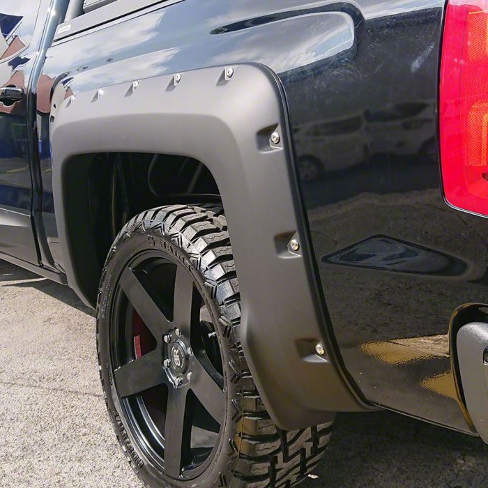 Application. The Air Design Satin Black Super Bolt Fender Flares fit all 2014 to 2018 Chevrolet Silverado 1500 models with the Standard and Long Box.