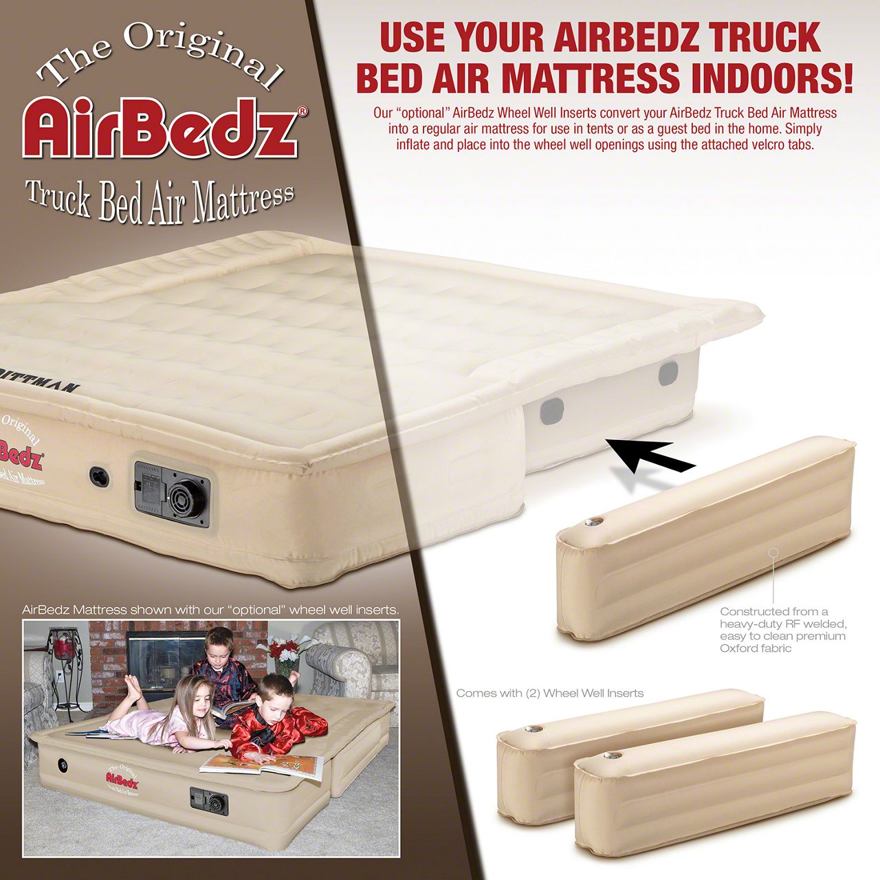 Enhanced Comfort and Utility. The AirBedz Original Series Wheel Well Side Inserts in Tan are designed to transform your vehicle's bed into a smooth, level surface for sleeping or resting. These inserts fill the void created by the wheel wells, allowing full use of the truck bed space when paired with an AirBedz mattress. Whether you're camping under the stars, resting between tasks on the job site, or relaxing at an event, these inserts enhance comfort and practicality by maximizing available surface area and providing reliable support across the bed floor.