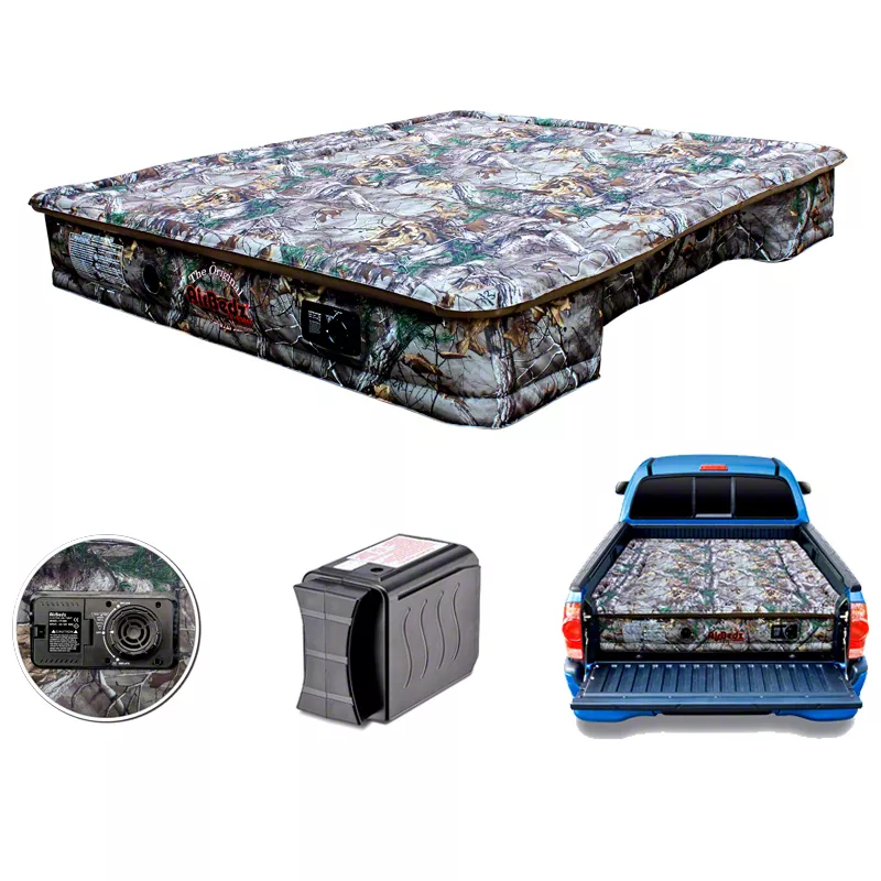 High-Quality Air Bed. Transform your truck bed into a relaxing sleeping area with this AirBedz Original Truck Bed Air Mattress with Built-in Rechargeable Battery Air Pump; Realtree Camouflage. It measures 76 inches long and 63.50 inches wide and fits the entire bed section of your truck. This gives enough space for hours of relaxation when camping outdoors. This air mattress is also designed to withstand harsh environments so you can spend the night sleeping comfortably and without worrying about this mattress’ safety and your comfort. Finally, this air mattress comes with a carry bag for easy storage, simple transportation, and keeping it safe from damage caused by the elements.