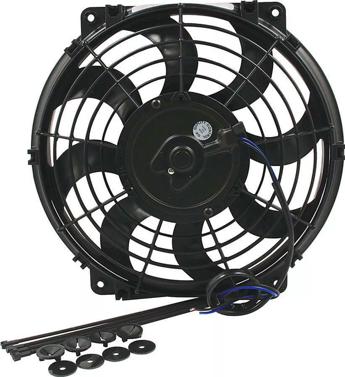 Construction and Appearance. Featuring a curved blade design for quiet, effective airflow, this 11-inch fan is built for flexible mounting as either a pusher or puller. It installs on either side of the radiator and includes a universal mounting kit. The fan is compact, lightweight, and designed for tight engine compartments or auxiliary cooling setups.