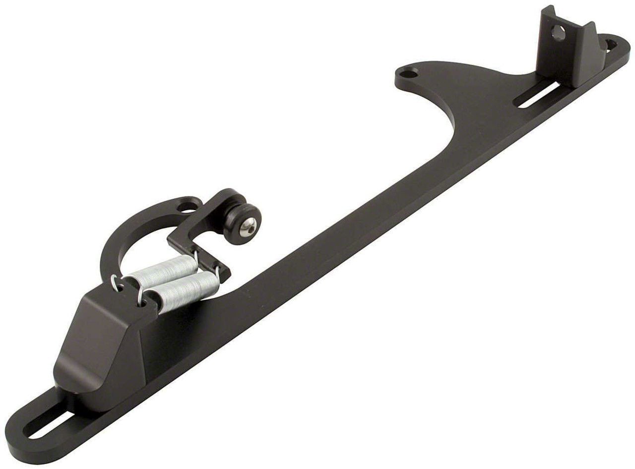 Billet aluminum throttle bracket securely mounts and holds throttle cable in place. Bracket fastens to carb mounting studs and includes dual stainless steel return springs which are adjustable for tension. Specially designed return spring arm attaches to the carb for simple installation and smooth operation. Low profile design clears most air cleaner assemblies. Optional transmission kickdown brackets mount to the underside of throttle cable brackets.