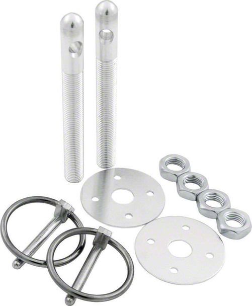 Kits include two aluminum 3-1/2" x 3/8" dia. pins, two aluminum scuff plates, two flip over style 3/16" dia. steel clips, and four nuts. Clip flips over stud and locks into place. Over-center action keeps clip in place.
