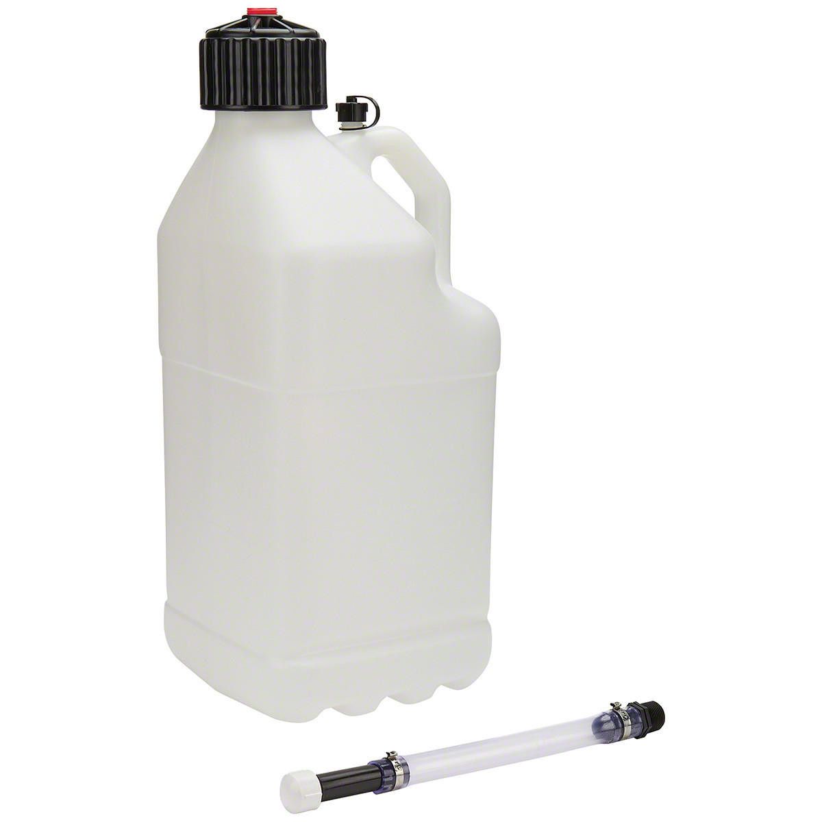 Utility Jugs With Filler Hose - 4-Pack 5-gallon utility jug features an o-ring sealed cap with a removeable 1/2" NPT plug for installing a filler hose and a screw-on style vent with attached lanyard. Square shaped body measures 9-1/2" x 9-1/2" x 23" tall. Utility jugs include a 12" flexible filler hose with a capped end for a secure seal.