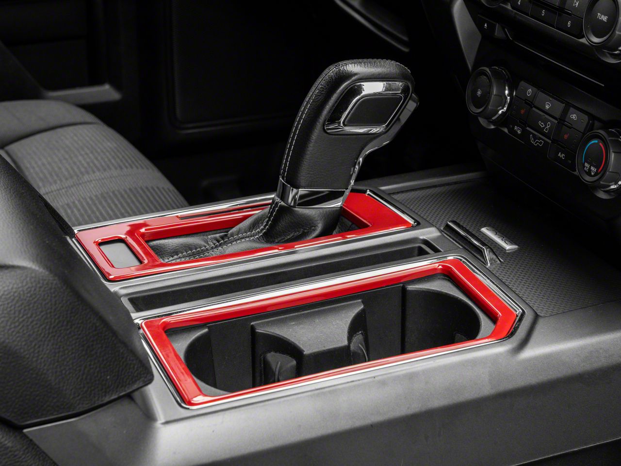 Custom Interior Styling. Add impressive custom show car styling to your F-150's interior with a set of RedRock Red Center Console Shifter Trim Bezels. These great looking, red Trim Bezel Accents are an inexpensive way to upgrade the appearance of your interior and they perfectly match RedRock's complete line of other red interior styling parts.