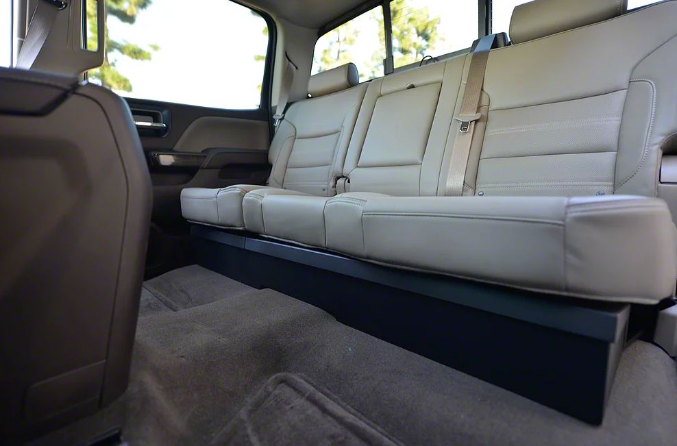 Lockable and Secure. The lack of under seat storage in your 2007-2018 Crew Cab Silverado can be really annoying, especially if you are transporting valuables or firearms. However, you can solve this issue by installing an RedRock Locking Under Seat Storage Box. This RedRock Under Seat Storage Box securely bolts to the rear seat brackets of your Silverado so it can't be removed and features metal hinges with cam style locks.