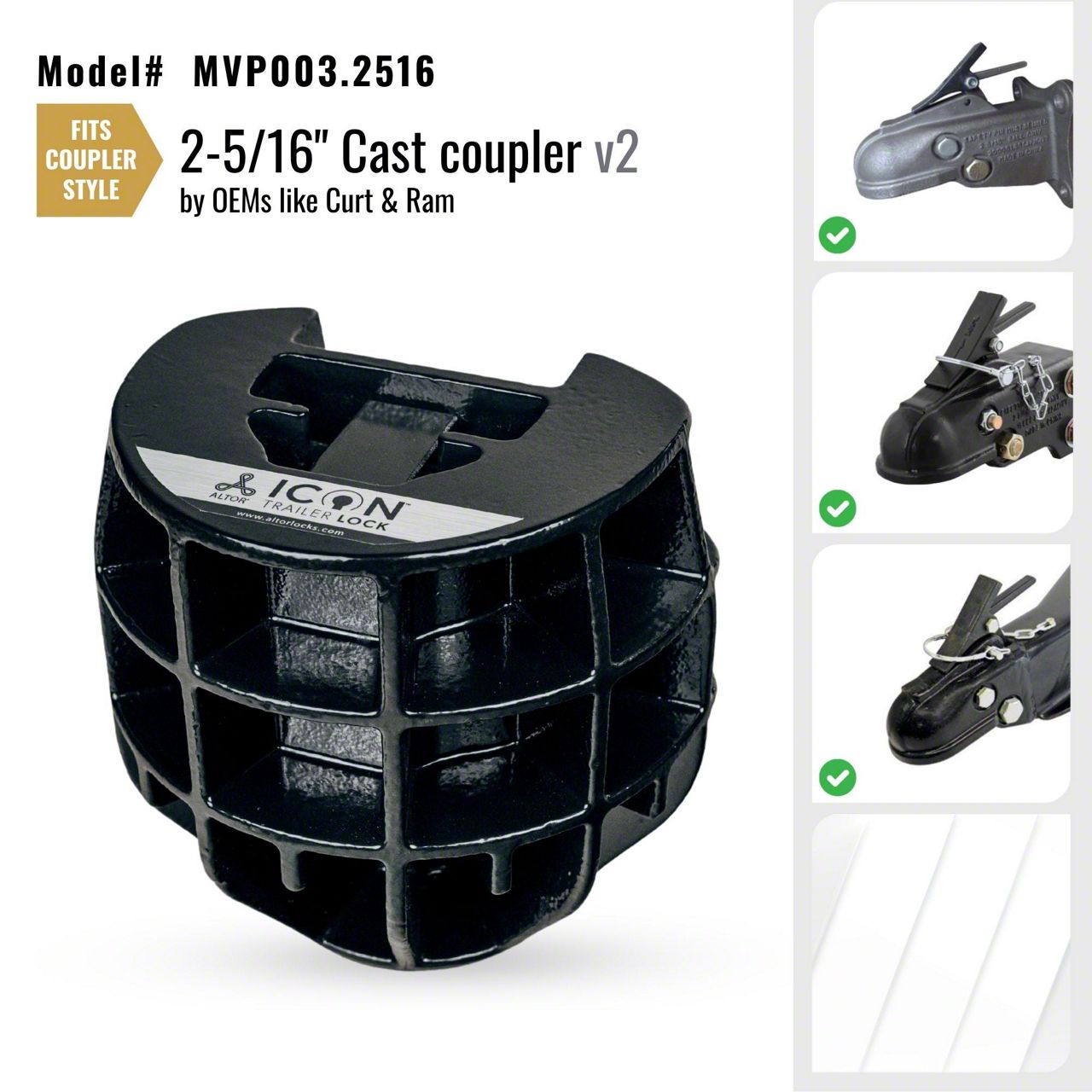 Application. The Altor Icon Trailer Coupler Lock for 2-5/16-Inch Hitch Ball; Cast Coupler V3 offers universal fitment.