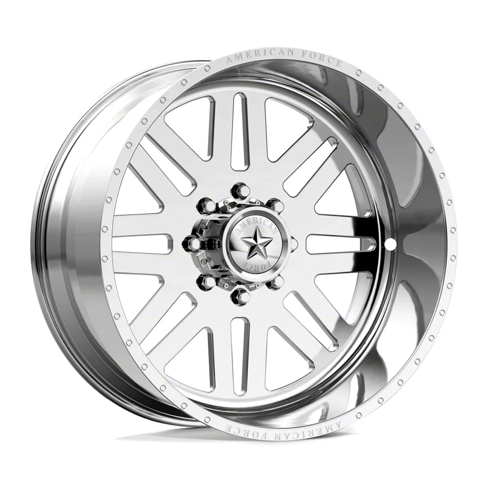 American Force 09 Liberty SS Polished 8-Lug Wheel; 24x12; -40mm Offset The American Force 09 Liberty SS Polished 8-Lug Wheel combines a sleek, sophisticated design with premium construction that enhances the visual appeal and complements a wide range of vehicle styles. This wheel is perfect for those seeking to make a bold statement while maintaining elegance and robustness.