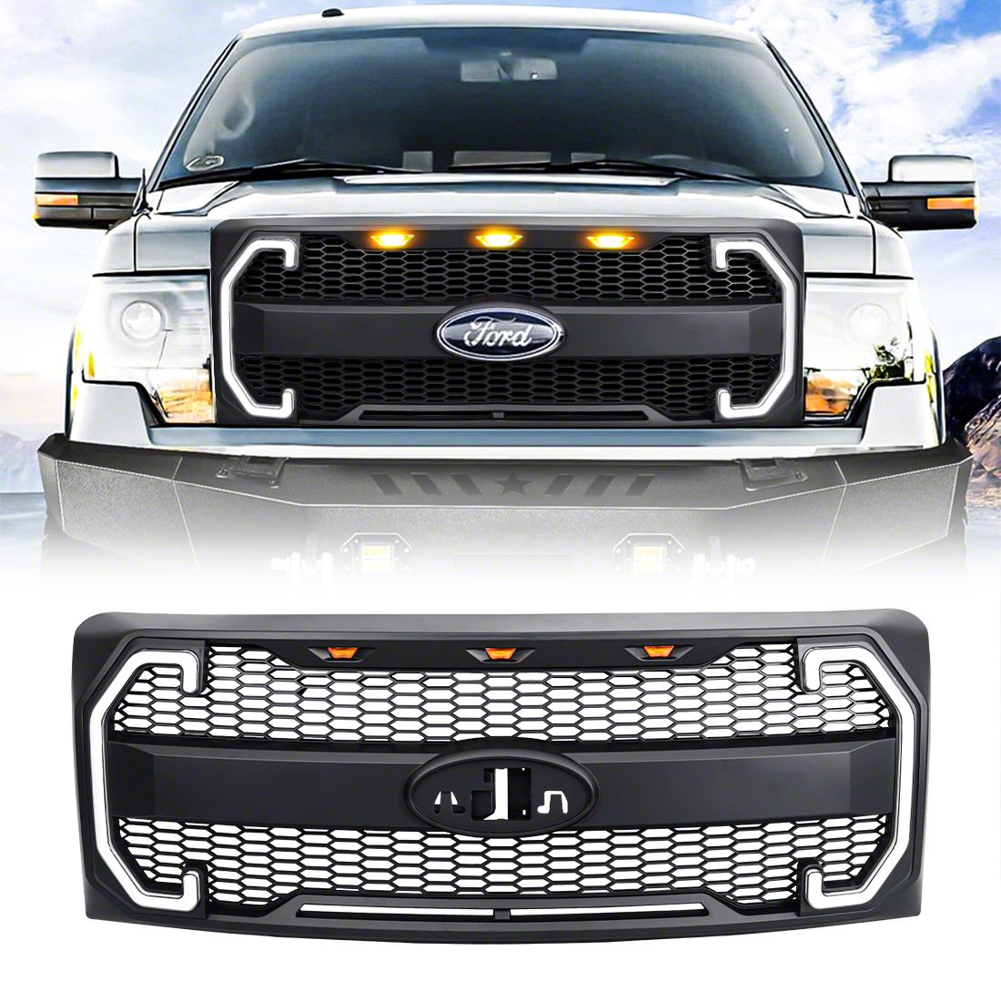 Aggressive Raptor-Inspired Style. This American Modified Upper Grille is designed for 2009-2014 Ford F-150 models, excluding Raptor models. It provides a rugged and aggressive appearance with a mesh design that enhances the truck's front-end look. The integrated DRL and turn signal lights add functionality and style.