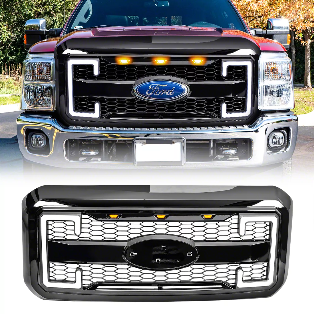 Construction and Appearance. Featuring a glossy black finish, the upper grille adds a sleek and durable touch to your vehicle. It is designed with an emblem base for additional customization, while the integrated lights add both function and flair, ensuring your F-250 stands out on and off the road.