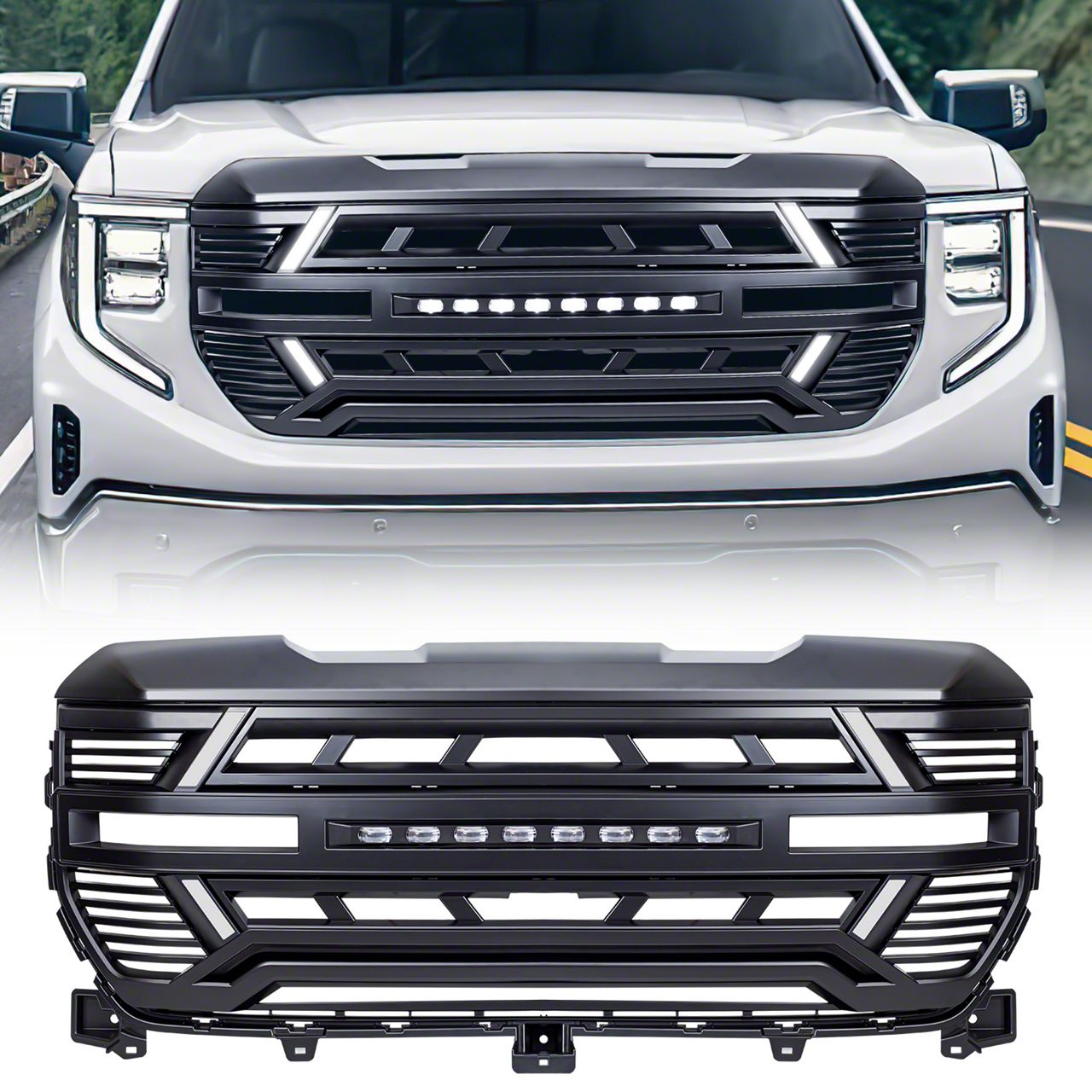 Aggressive Front-End Styling. The American Modified Armor Upper Grille delivers a bold visual upgrade while adding practical protection to your vehicle’s front end. Built for Fits 2022-2026 GMC Sierra 1500 Models, this grille includes DRL lights, LED off-road lights, and a camera bracket for enhanced visibility and utility. Its aggressive styling and functional features make it a standout replacement for the factory unit.