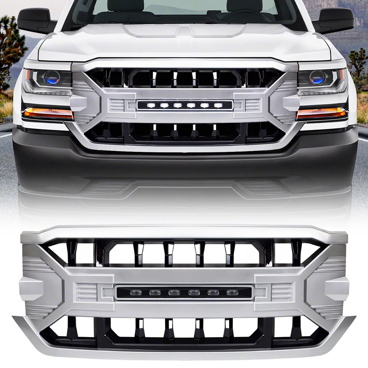 Application. This American Modified Armor Upper Replacement Grille with LED Off-Road Lights in Chrome fits all 2016-2018 Chevrolet Silverado 1500 models.