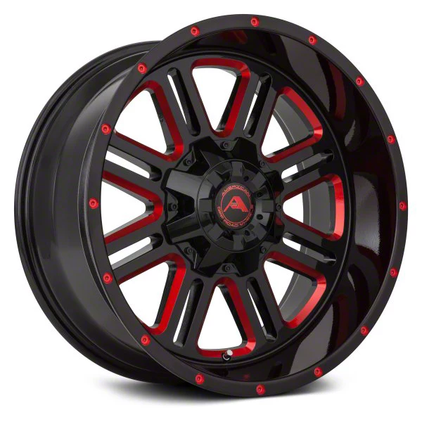 This 20x10 American Off-Road Wheels A106 Gloss Black Milled with Red Tint 6-Lug Wheel is completed in a high-quality gloss black finish with milled accents and hints of red to create an impressive appearance. There's a durable clear coat that protects against driving hazards.