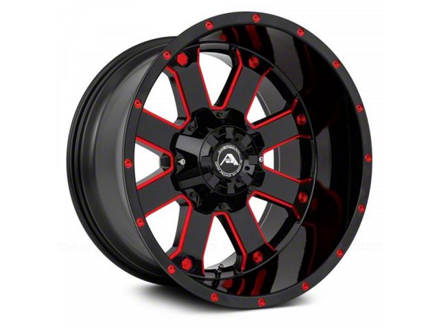 American Off-Road Wheels A108 Gloss Black Milled with Red Tint 6-Lug Wheel; 20x10; -24mm Offset. The American Off-Road Wheels A108 Gloss Black Milled with Red Tint 6-Lug Wheel offers a striking balance of style and refinement. Its unique design accentuates the vehicle's aesthetic, while the premium construction underscores its robust nature. This wheel is a perfect choice for those seeking both elegance and a strong visual statement.