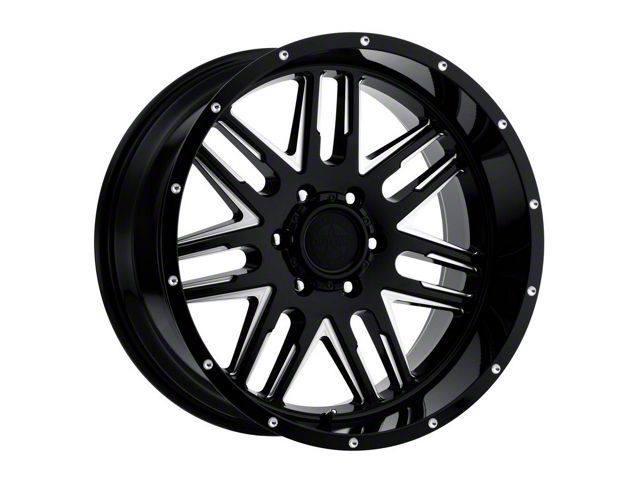 American Outlaw Wheels 12 Gauge Gloss Black Milled 8-Lug Wheel; 20x10; -18mm Offset exudes sophistication with its finish, offering a sleek and modern appeal to any vehicle it adorns. The design is meticulously crafted to enhance the aesthetic of your vehicle, giving it a distinctive and upscale look. Perfect for those seeking to elevate their vehicle's style, this wheel blends seamlessly with both contemporary and classic vehicle designs, making it a versatile choice for a wide range of vehicles. Its robust construction ensures durability, making it a reliable choice for drivers who value both style and quality.