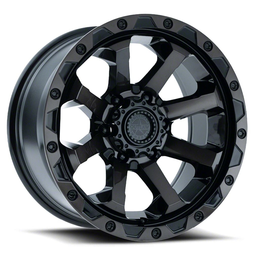American Outlaw Wheels Capone Gloss Black with Dark Tint 6-Lug Wheel; 17x8.5; 0mm Offset exudes sophistication with its finish, offering a sleek and modern appeal to any vehicle it adorns. The design is meticulously crafted to enhance the aesthetic of your vehicle, giving it a distinctive and upscale look. Perfect for those seeking to elevate their vehicle's style, this wheel blends seamlessly with both contemporary and classic vehicle designs, making it a versatile choice for a wide range of vehicles. Its robust construction ensures durability, making it a reliable choice for drivers who value both style and quality.