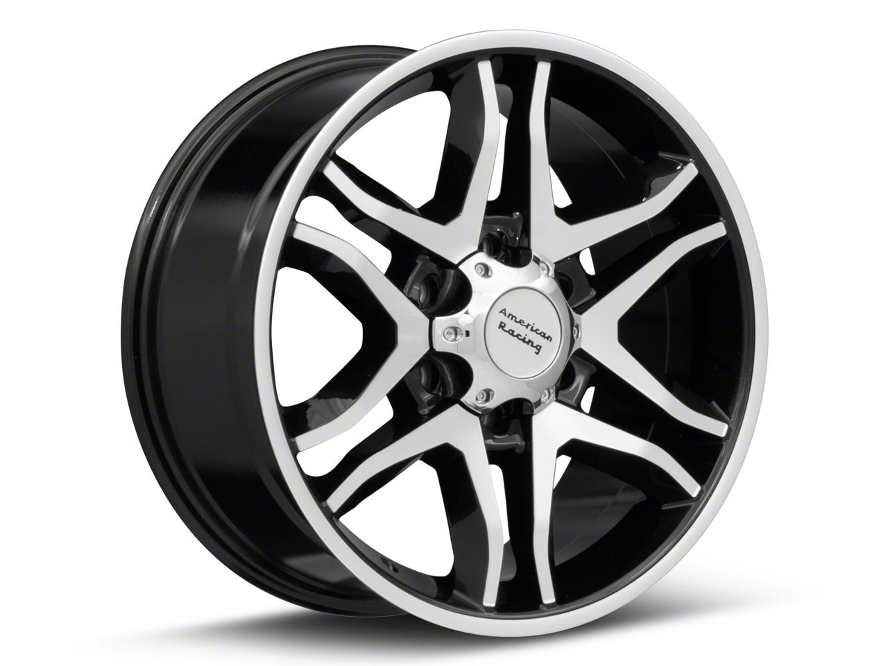 This 18x8.5 American Racing Mainline Gloss Black Machined 6-Lug Wheel is completed in a high-quality gloss black finish with machined accents to create an impressive appearance. There's a durable clear coat that protects against driving hazards.