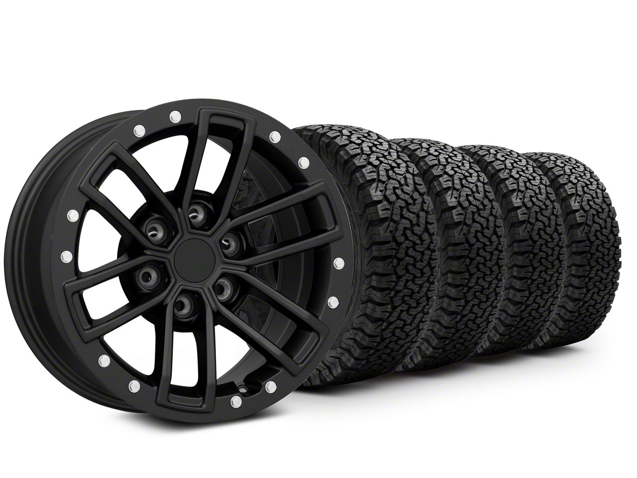 Mounted and Balanced Wheel and Tire Kit. This wheel and tire combo kit features (4) 17x8.5 Raptor Beadlock Style Matte Black 6-Lug Wheels and (4) BF Goodrich All-Terrain T/A KO 285/70R17 tires that have been put together into an easy to buy kit that arrives to your door already mounted and balanced ready to be installed on your vehicle.