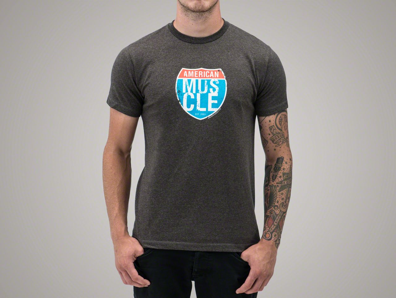 AmericanMuscle Interstate. This AmericanMuscle Interstate T-Shirt is a great looking shirt to add to your wardrobe. This stylish shirt features a full color interstate sign version of the AmericanMuscle front and center, while a smaller white AM logo is on the back. This is the piece of attire to wear at track events, fishing trips or just relaxing outside on a warm night.