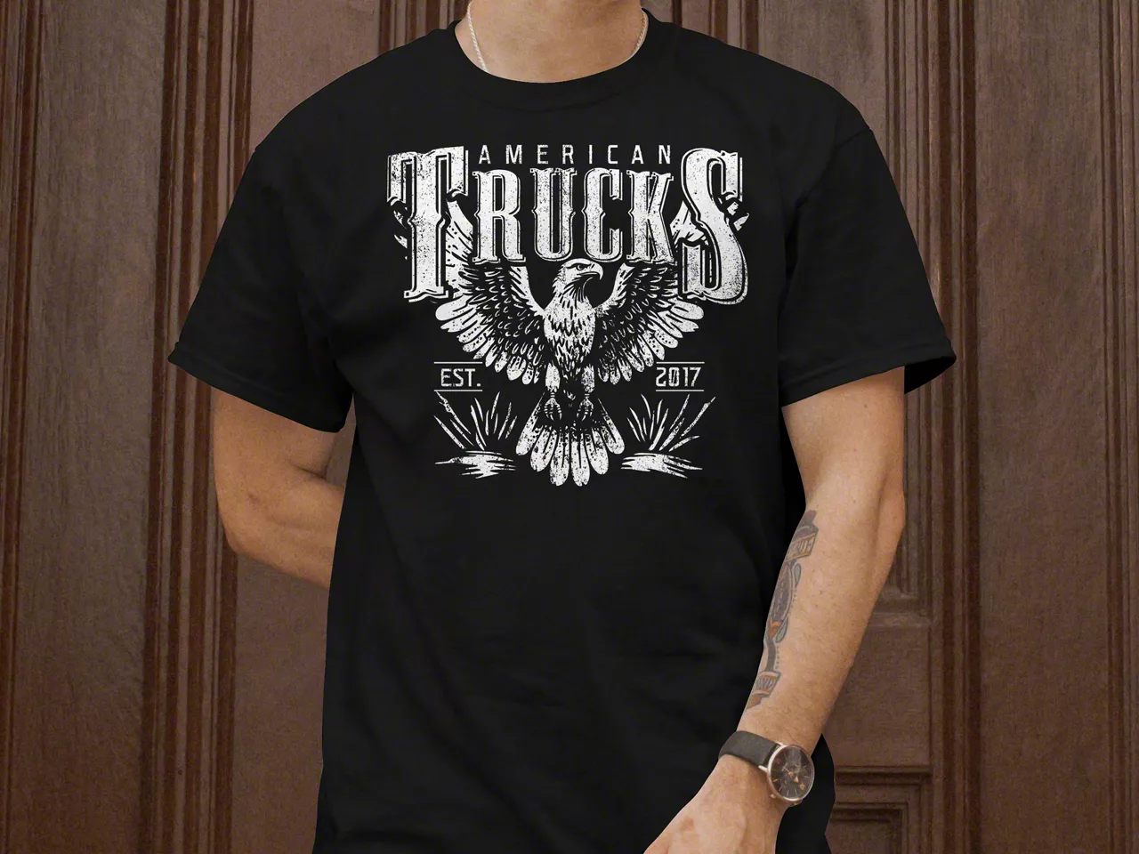 Design. The black T-shirt has "AMERICAN TRUCKS" written across the top with "TRUCKS" boldly sticking out. There is an eagle extending its wings and "EST. 2004" towards the bottom of the design. The whole presentation looks impressive.