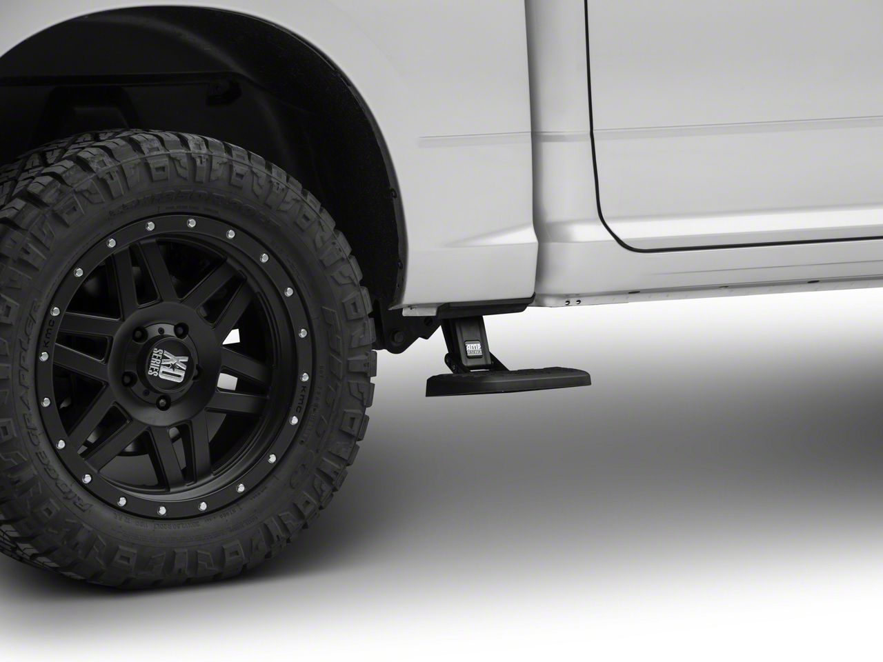 Side steps for hard-working trucks. The AMP Research Bedstep2 mounts just behind the cab, forward of the rear wheel, providing a faster, easier and safer route to access toolboxes, equipment and cargo in the bed. Easily installed, this frame-mounted, retractable truck step can be mounted on either side of the truck box, and it flips down or retracts with just the nudge of your foot.