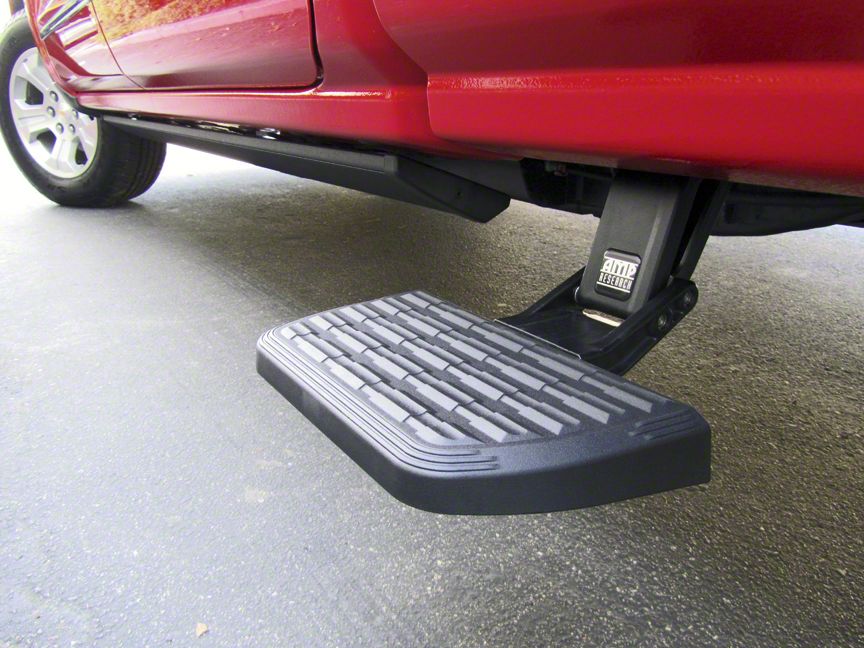 Side steps for hard-working trucks. The AMP Research Bedstep2 mounts just behind the cab, forward of the rear wheel, providing a faster, easier and safer route to access toolboxes, equipment and cargo in the bed. Easily installed, this frame-mounted, retractable truck step can be mounted on either side of the truck box, and it flips down or retracts with just the nudge of your foot.