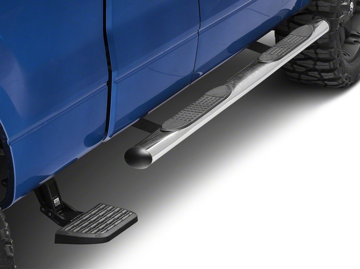 Side steps for hard-working trucks. The AMP Research Bedstep2 mounts just behind the cab, forward of the rear wheel, providing a faster, easier and safer route to access toolboxes, equipment and cargo in the bed. Easily installed, this frame-mounted, retractable truck step can be mounted on either side of the truck box, and it flips down or retracts with just the nudge of your foot.